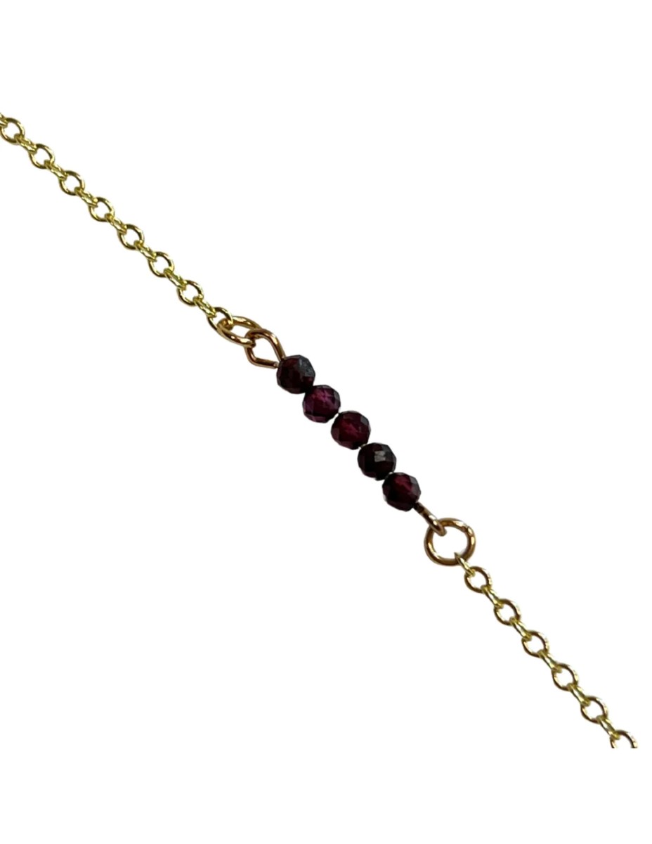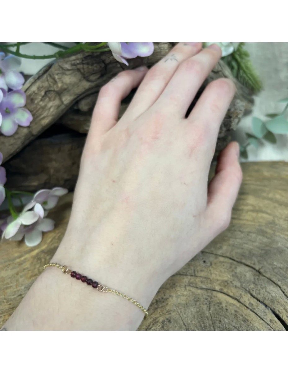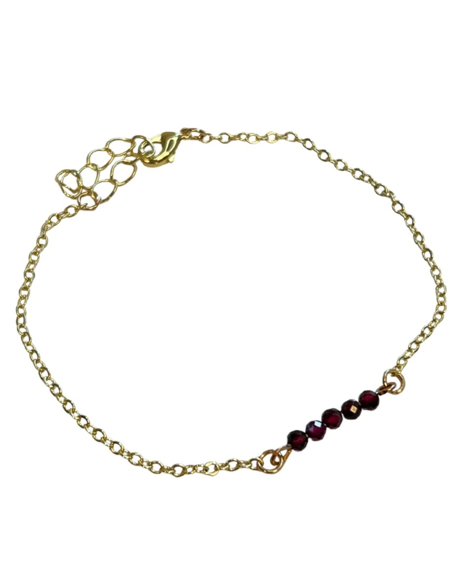 Schattig armbandje met gefacetteerde Granaat steentjes, het armbandje is van koper, maar heeft een klein verguld laagje. De steentjes zijn ca. 3 mm breed en de lengte van de armband is verstelbaar met de handige sluiting. De vindplaats van deze Granaat is Afrika. Draag hem zelf of geef hem cadeau aan een vriend/vriendin en vier de lente met dit fijne armbandje!