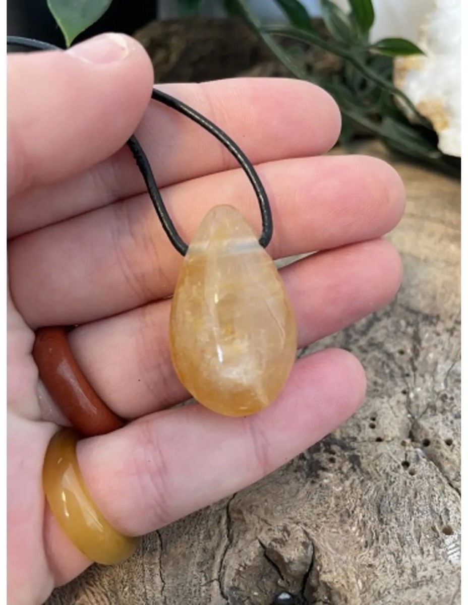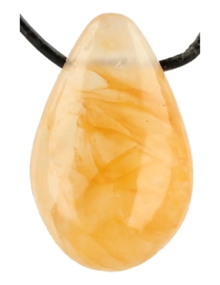 Druppelhanger van Golden Healer in AA-kwaliteit aan een leren koord. De hanger is 30-40 mm lang en 20-25 mm breed. De vindplaats is Madagaskar. De Golden Healer hanger wordt met leren koord geleverd.
