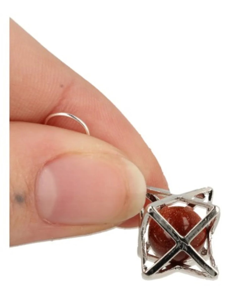 Oorhangers met een Goldfluss bolletje in een zilverkleurig merkabah kooitje. Het bolletje van de edelsteen Goldfluss groen is ca. 1 cm in doorsnee en de kooihanger heeft een hoogte van 2.5 cm.