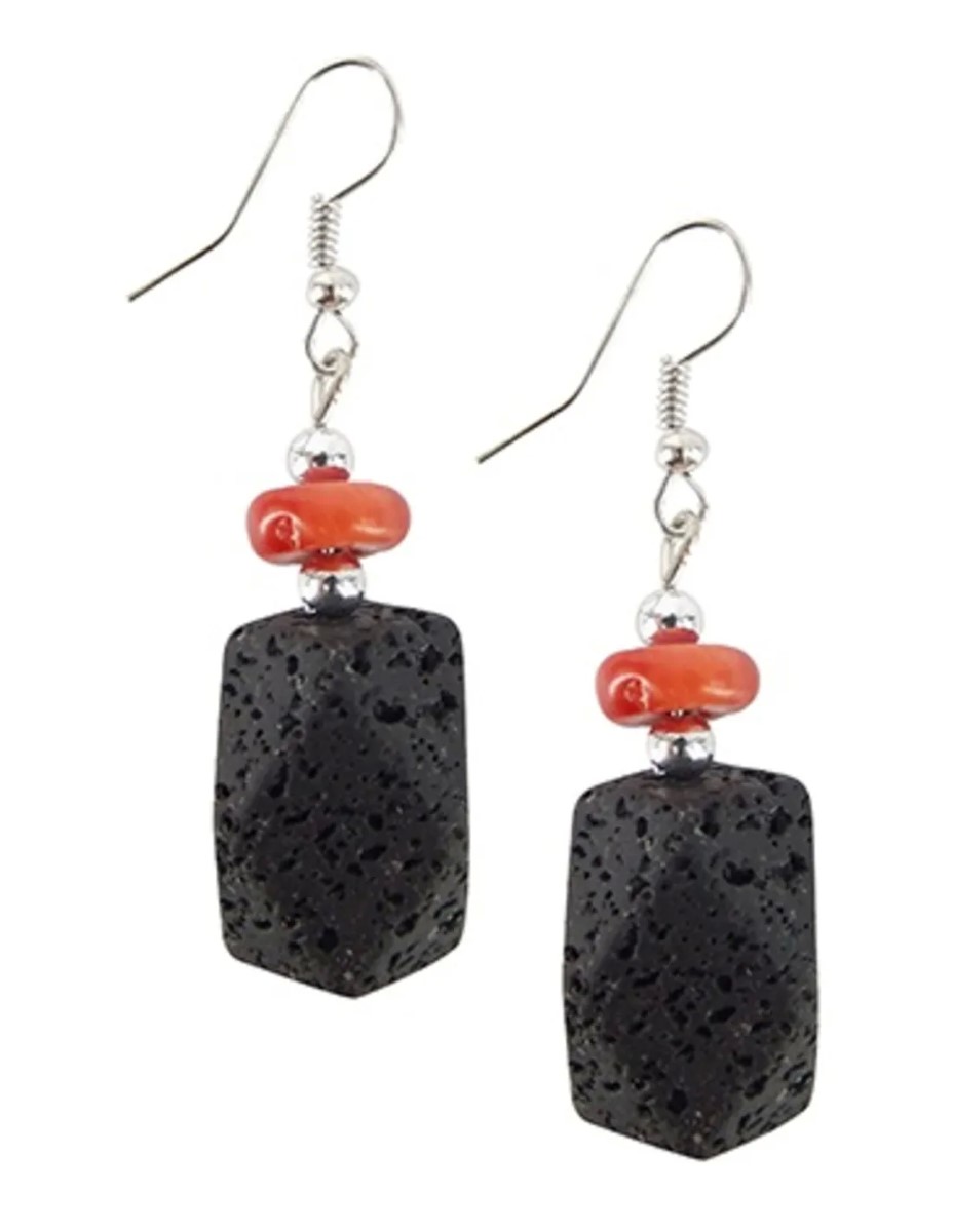 Lavasteen en rode koraal oorbellen. Deze oorhangers zijn van nikkelvrij materiaal. De oorbellen zijn 30 mm lang (zonder haakje).
