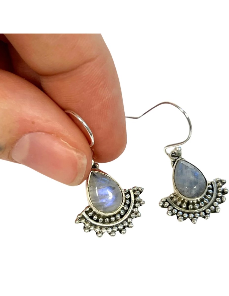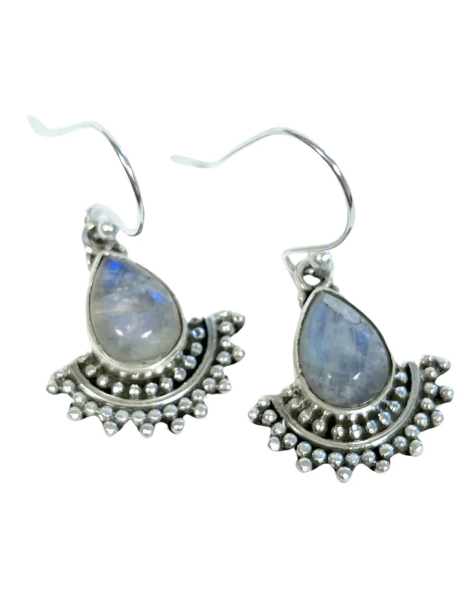 Bijzondere design oorbellen van 925 sterling zilver met daarin een Maansteen steentje. De oorbellen zijn handgemaakt in India. Ze zijn 1,5 cm lang en ca. 1,5 cm breed. Maak je outfit af met deze prachtige oorhangers of combineer ze met onze andere Maansteen sieraden.