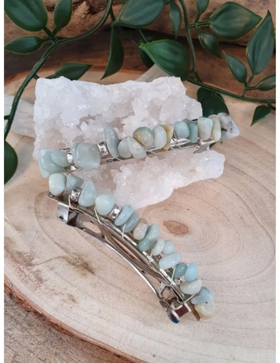 Unieke haarclip met Amazoniet steentjes. De Amazoniet haarclip is 7 cm en weegt 10 gram. Deze haarclip is makkelijk in het haar te bevestigen.