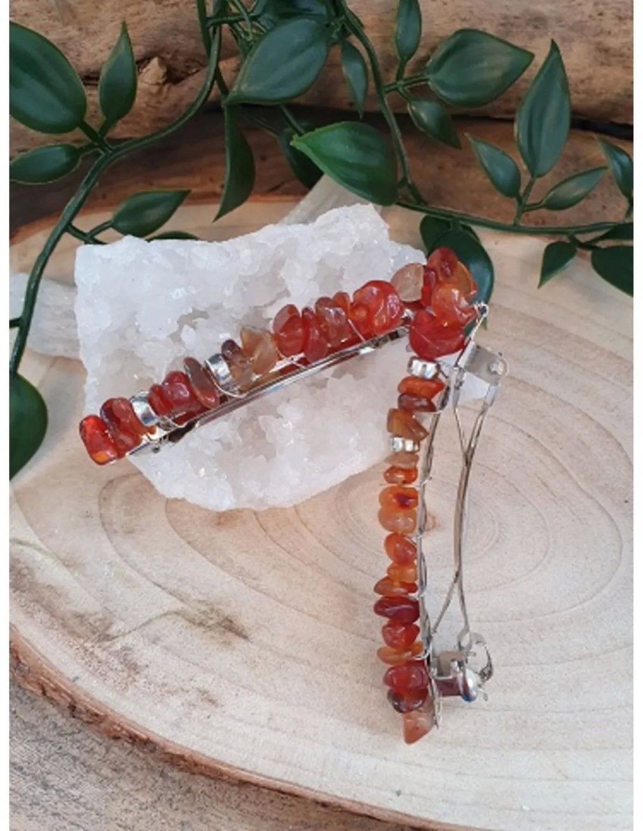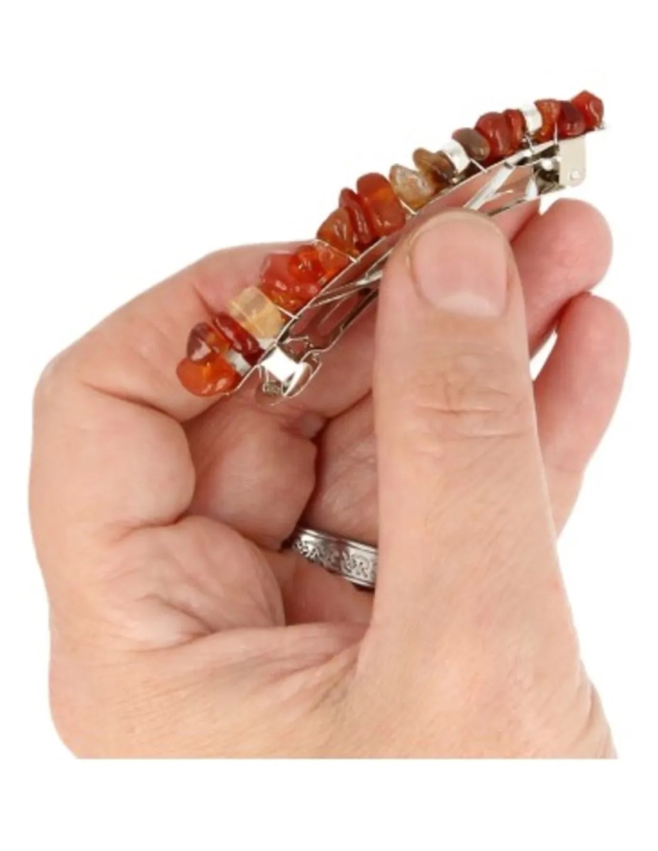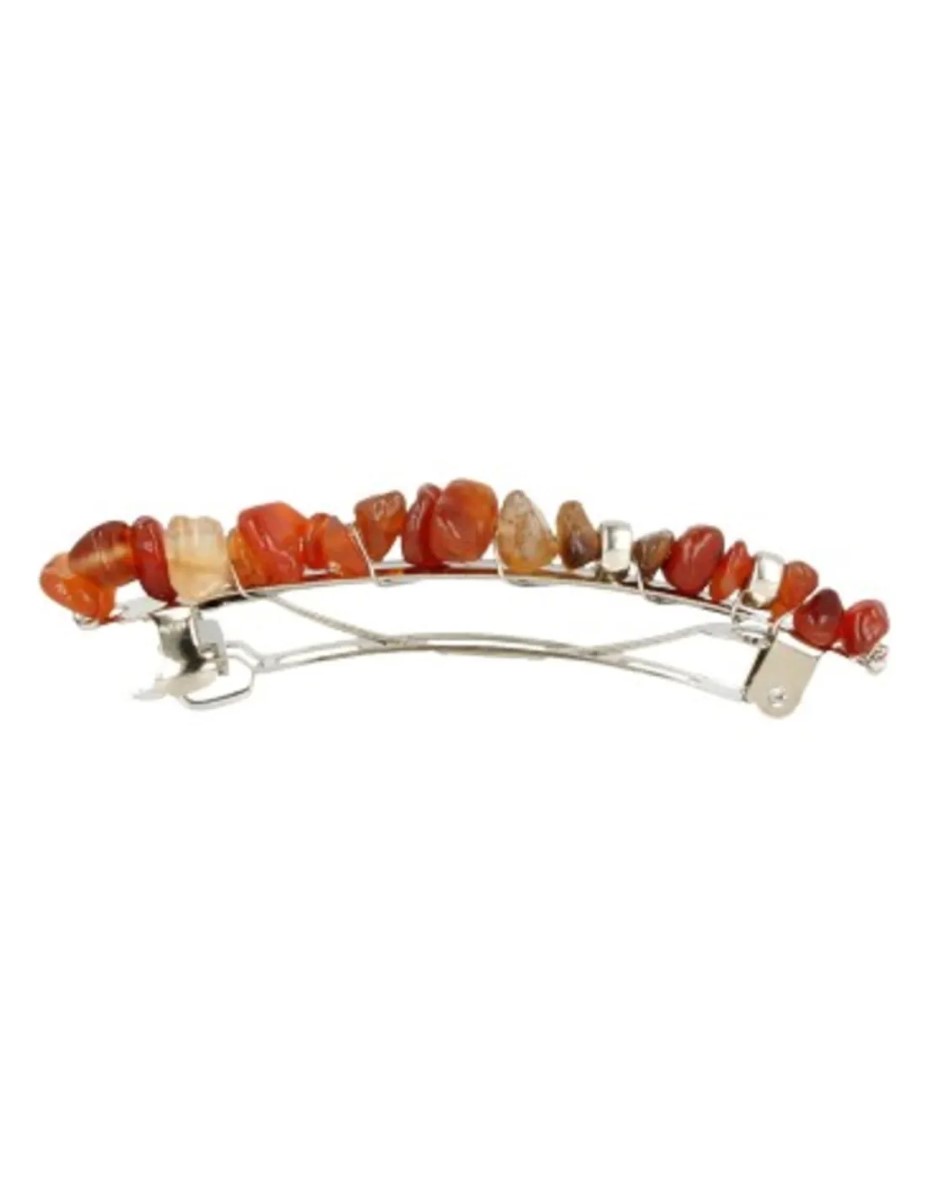 Mooie haarclip met Carneool steentjes. De Carneool haarclip is 7 cm lang en weegt 101 gram. De haarclip is makkelijk in het haar te bevestigen.