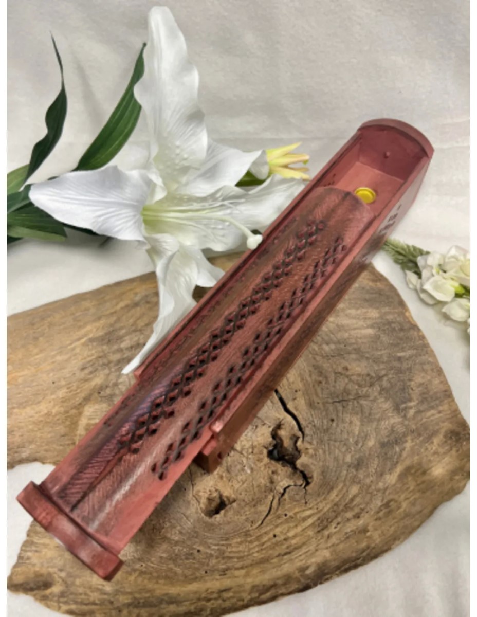 Deze wierookbrander opent men door de middel van een schuivend bovenblad, dus geen klemmende branders meer. Zowel voor wierookstokjes als kegels en heeft een opbergruimte voor de stokjes. Formaat is 31 x 7 x 6,5 cm.