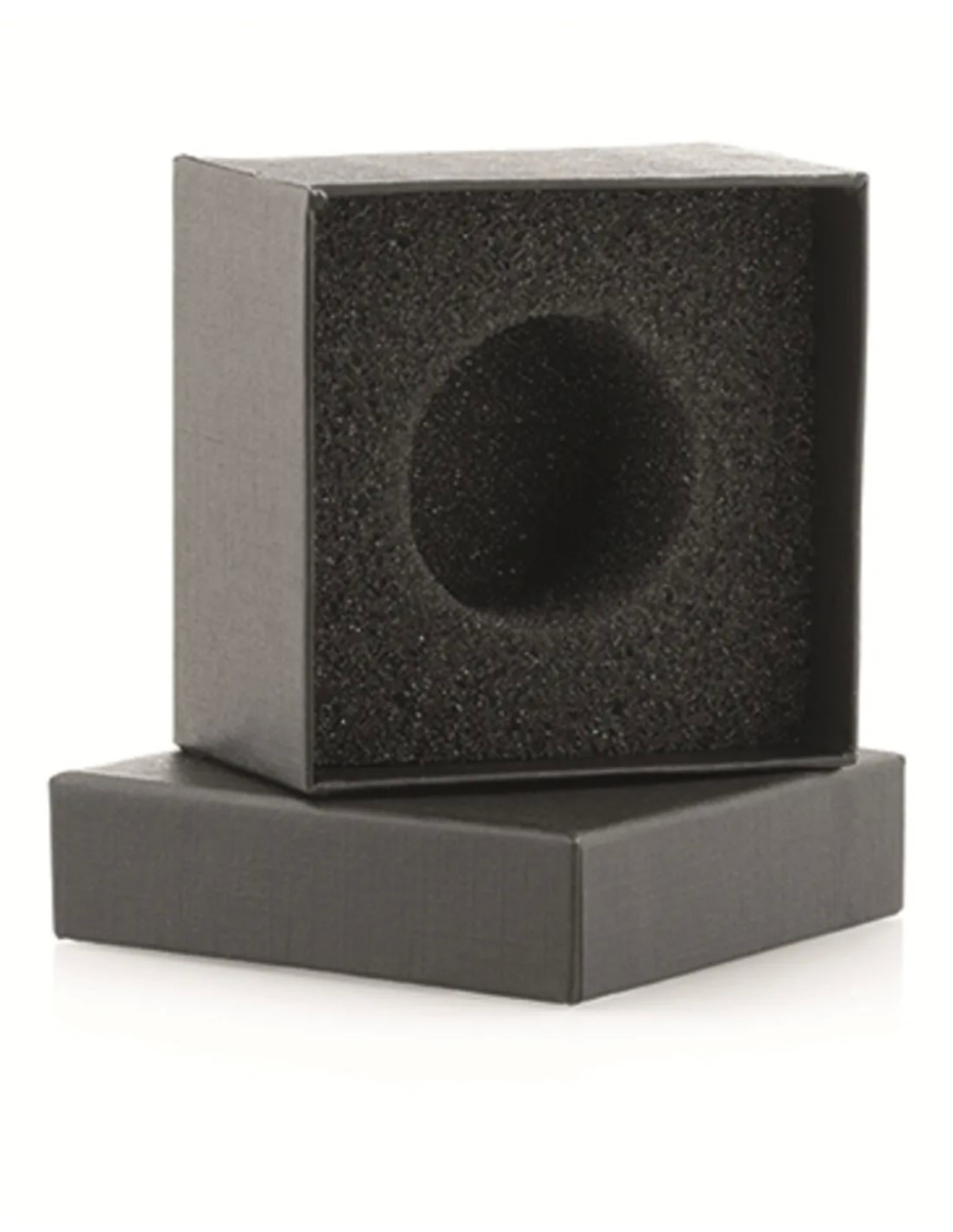 Verpakkingsdoosje zwart, de binnenkant bevat een vierkante schuimvorm met een gat (45 mm) zodat het artikel gefixeerd kan worden. Het schuim zit los, dus kan eventueel verwijderd worden indien nodig.