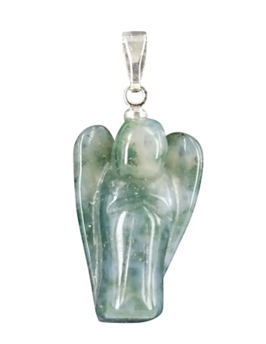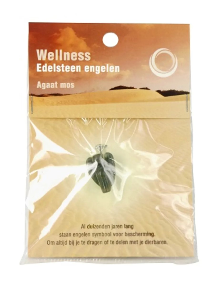 Agaat mos engelenhanger op displaykaartje. De hanger is 20 mm.