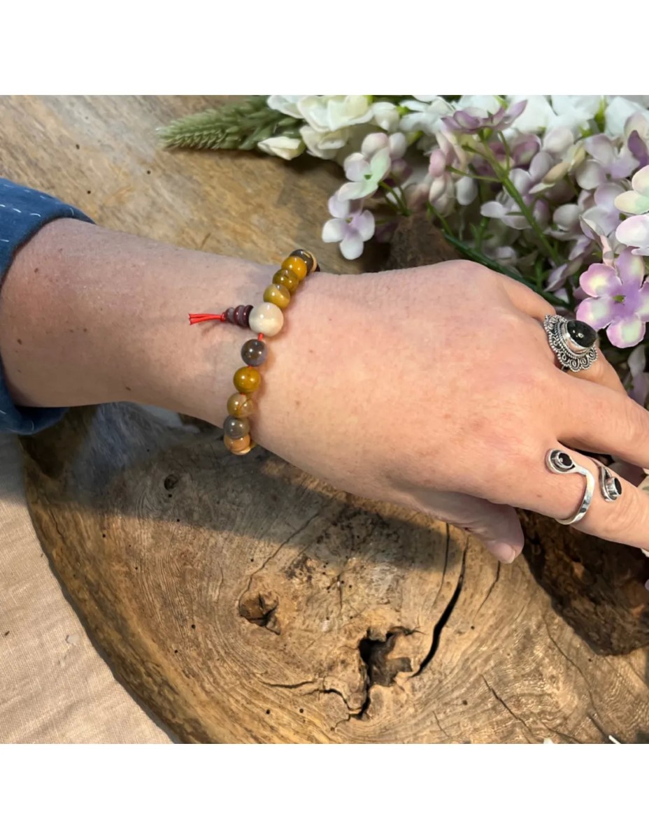 Mokaiet powerbead edelstenen armband met een displaykaartje, de armband is 18 cm lang en geregen op elastiek met 8 mm kralen.