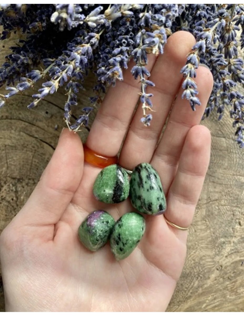 50 gram edelsteen trommelstenen Robijn in Zoisiet, formaat 10 tot 25 mm. Er zitten ca. 3-4 stenen Robijn in Zoisiet in 50 gram.