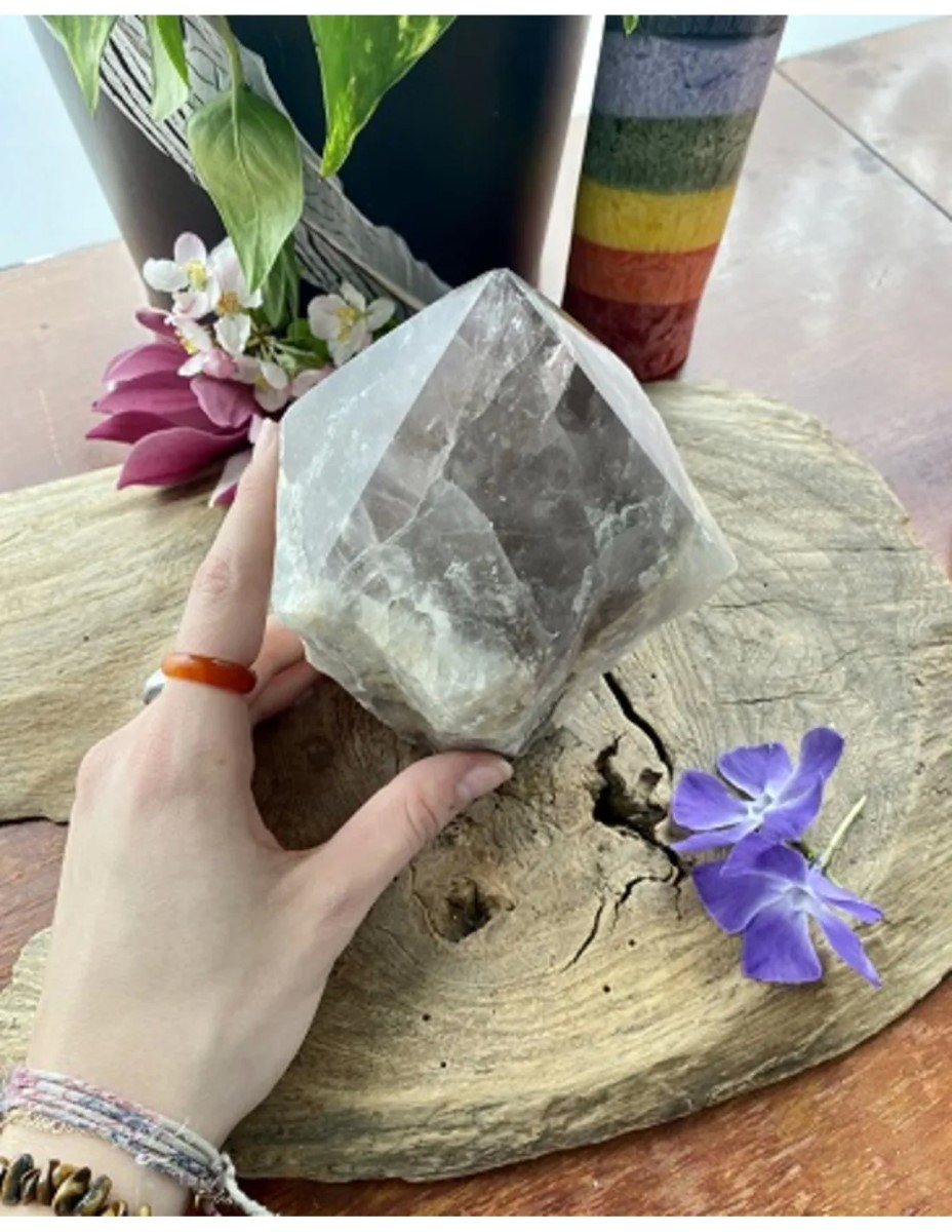 Edelsteen punt van Amethist, hij is 1,838 kilo en 15 x 12,5 x 10 cm. Enkel de punt is gepolijst, vindplaats van deze Amethist is Bolivia.