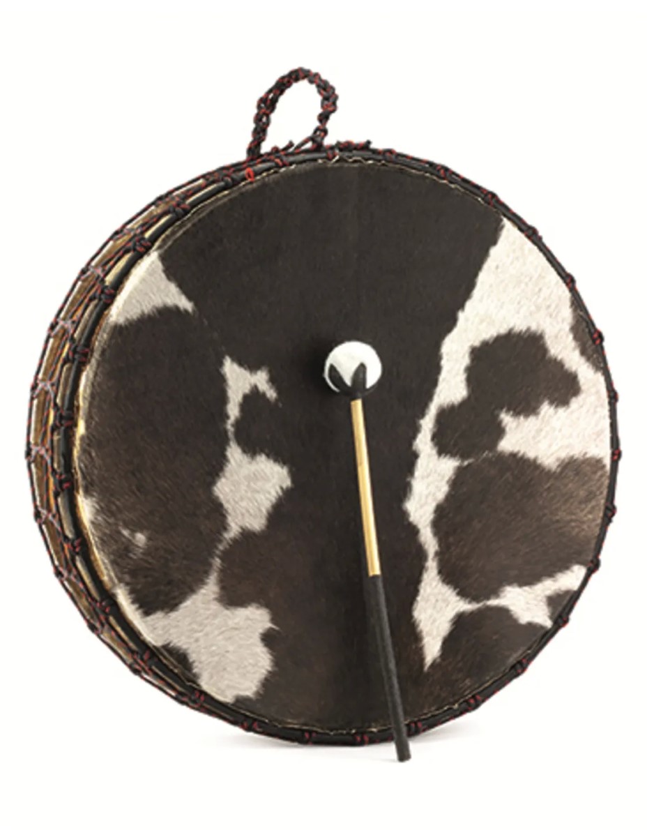 Sjamanentrommel met stok en draagtas. De trommel is gespannen met geitenvel. Hij is zelf opnieuw te spannen voor een optimaal geluid.