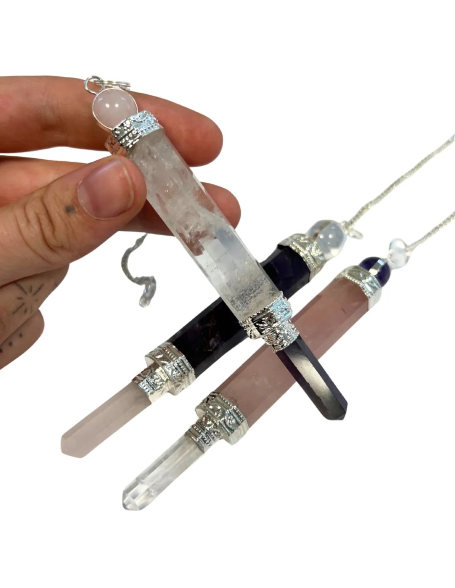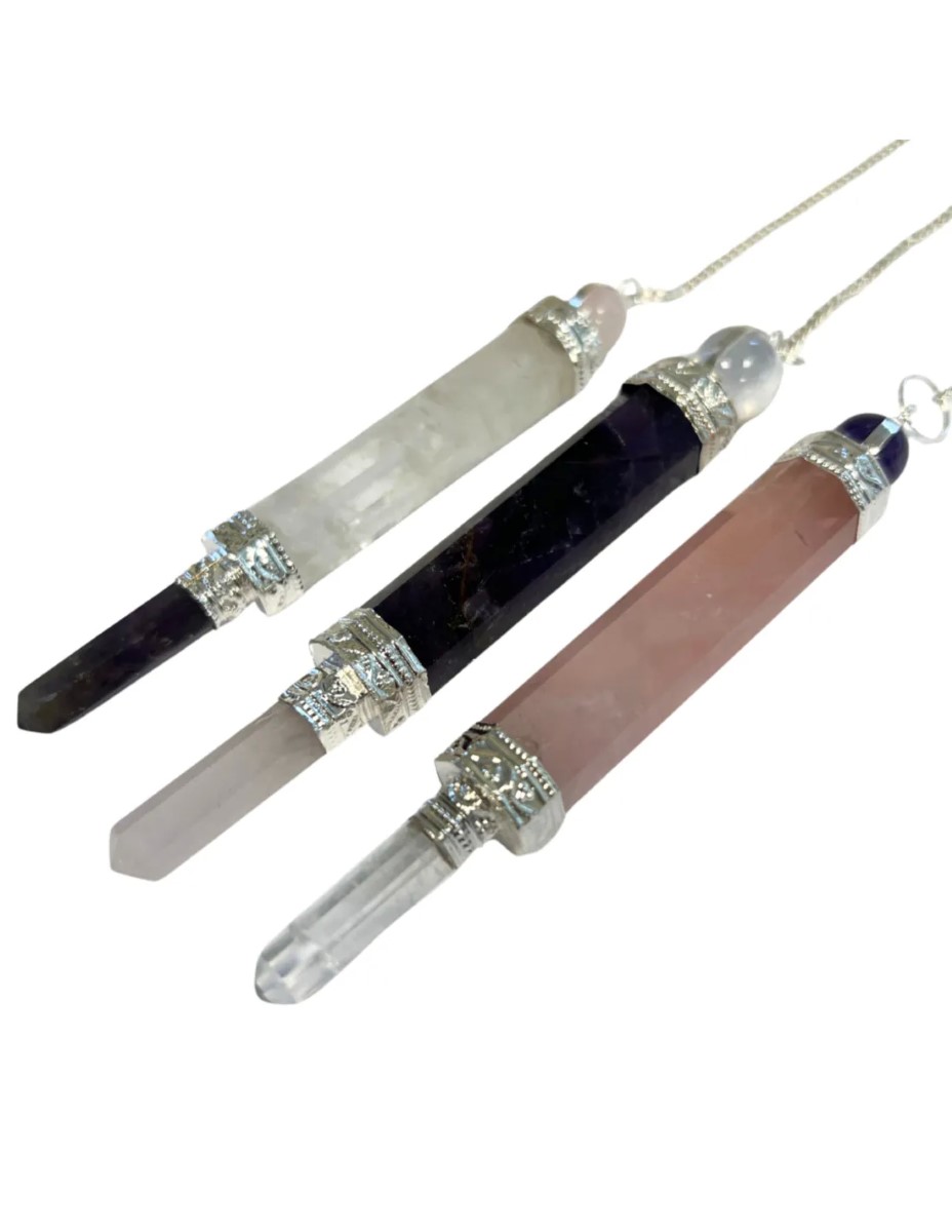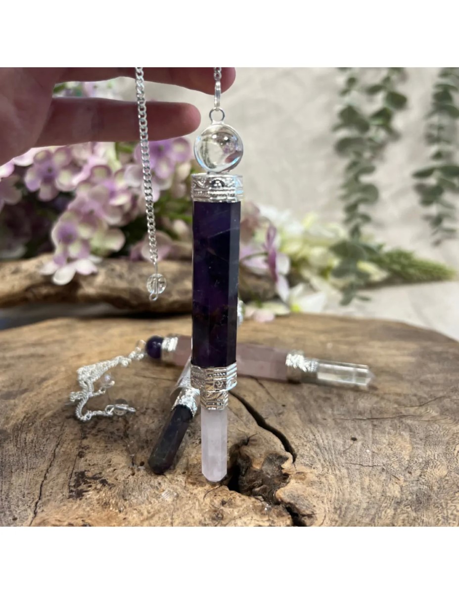 Luxe pendel verzilverd Drie-eenheid, deze pendel bestaat uit 3 delen en is ca. 7 cm. De stenen zijn Amethist, Bergkristal en Roze kwarts, de volgorde van de stenen kan verschillen van de foto. De pendel is handwerk dus hij kan afwijken van de foto en/of niet compleet recht zijn.